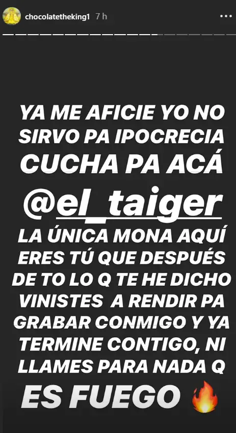 «Ya me asfixie, yo no sirvo para la hipocresía. Cucha pa acá: El Taiger, la unica mona aquí eres tu que después de todo lo que he dicho viniste a rendir para grabrar conmigo. Ya termine contigo, ni me llames nada que es fuego», escribió el Rey de los reparteros en los historys de su Instagram.