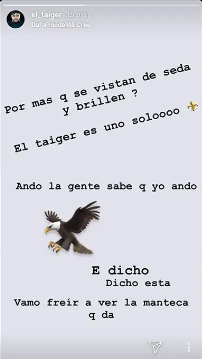 Por más que se vistan de seda y brillen… El Taiger es uno solo. Ando, la gente sabe que yo ando. E dicho, dicho está. Vamos a freír a ver la manteca que da», escribió El Taiger en su cuenta.