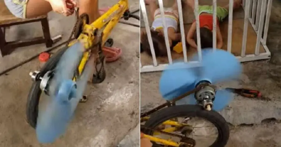 La creación de Abreu no es más que unas aspas de ventilador acopladas a la catalina de una bicicleta que se mueven de forma manual con los pedales y que requieren de la “energía” de una persona para que funcione.