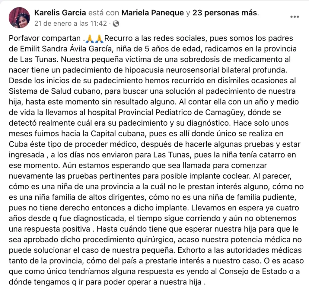 Estos padres cubanos concluyeron el mensaje preguntando cuánto tendría que esperar su hija para recibir la aprobación para el procedimiento quirúrgico y expresaron su deseo de que las autoridades médicas provinciales y nacionales le prestaran atención al caso de su pequeña.