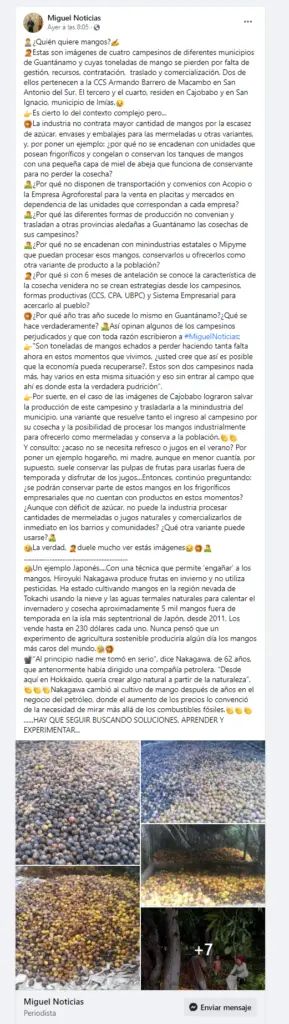 Más adelante, Reyes aclara que uno de los denunciantes pudo resolver parcialmente su situación: «En el caso de las imágenes de Cajobabo, lograron salvar parte de la producción de este campesino y trasladarla a una miniindustria del municipio. Esta opción permite que el agricultor obtenga ingresos por su cosecha y que los mangos sean procesados industrialmente para ofrecer mermeladas y conservas a la población», señala.