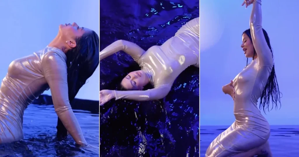 Cada segundo del video está cargado de detalles que hipnotizan: las luces azules reflejadas sobre la superficie del agua, el brillo del vestido, las gafas de sol que le dan ese toque de diva futurista, y su cabello mojado que completa la estética perfecta. Todo bajo una atmósfera entre sensual y cinematográfica, muy al estilo de las grandes producciones visuales.
