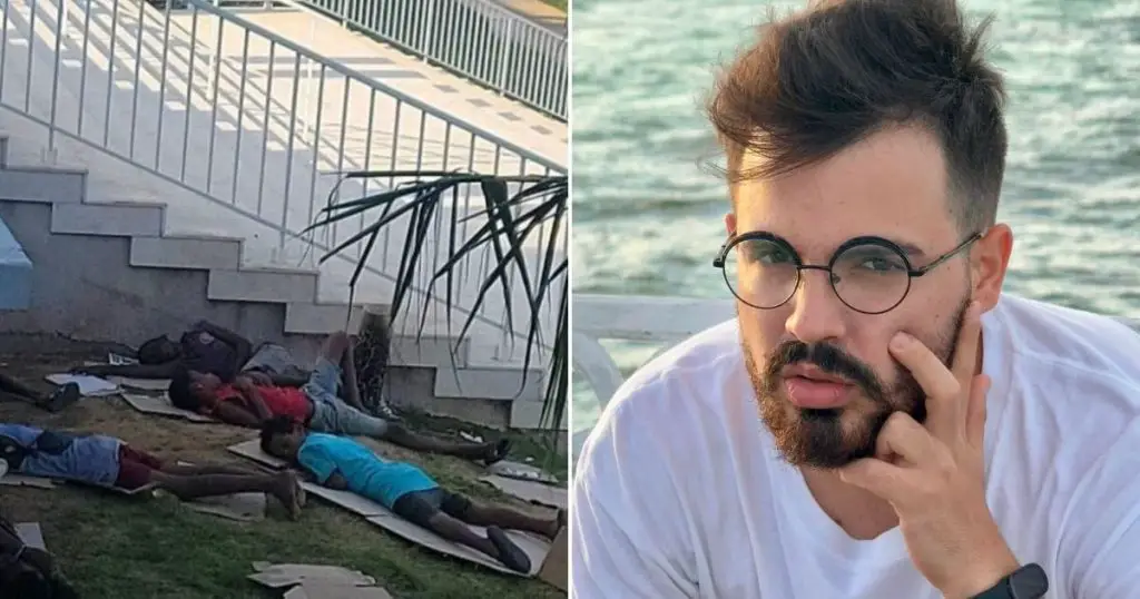 Velázquez aseguró que, según trabajadores, jardineros y vendedores del área, los niños aparecen allí desde hace más de un mes. Algunos incluso llegan con uniforme escolar y cuelgan su ropa en las escaleras del hotel para secarla.