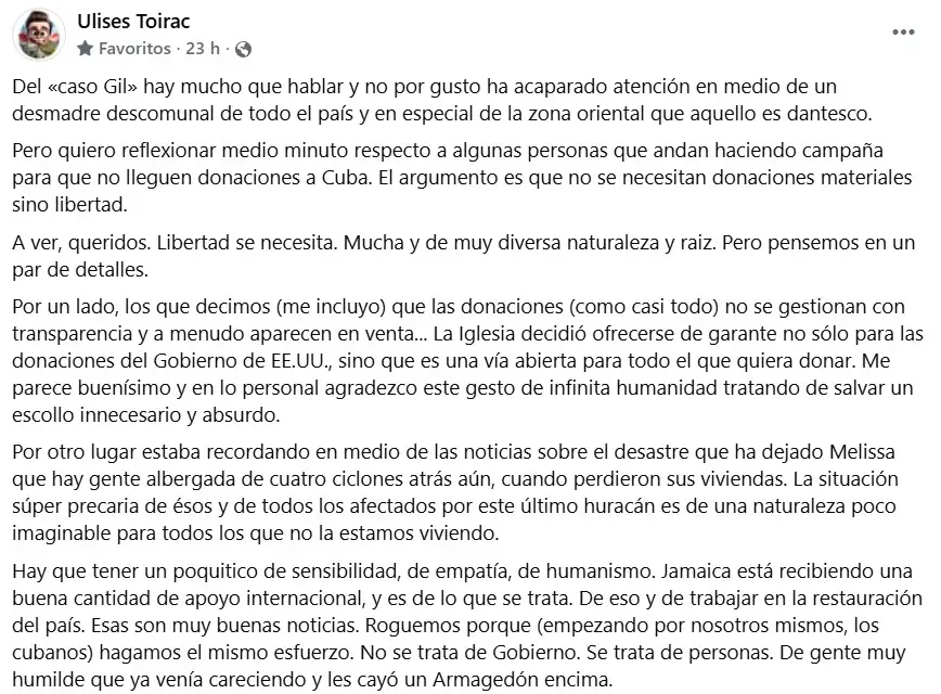 Toirac, acostumbrado a usar la ironía como escudo y espada, esta vez habló sin rodeos. Contó que lleva días viendo las imágenes del oriente del país y que lo que está pasando allí no es solo grave: es “dantesco”. Y claro, en las redes el debate está encendido. Hay quienes dicen que no se debe mandar nada, que Cuba lo que necesita no son donaciones, sino libertad. La eterna discusión. Pero él decidió poner el freno y pedir un poco de humanidad.