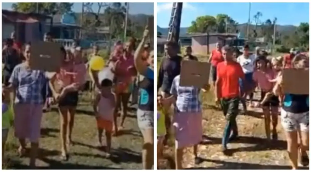 Las imágenes y reportes de Martí Noticias muestran a madres con sus niños en brazos, hombres y vecinos de todas las edades gritando “¡Queremos corriente!”, cargando carteles improvisados y denunciando que las autoridades locales los han abandonado. Uno de los manifestantes lo dijo sin rodeos: “Habían más de 200 casas y no quedan ni 40. Quieren desaparecer el barrio”. Otro añadió que todos los días hablan con el delegado y el presidente del Consejo Popular, pero nadie da respuesta, nadie resuelve y nadie aparece.