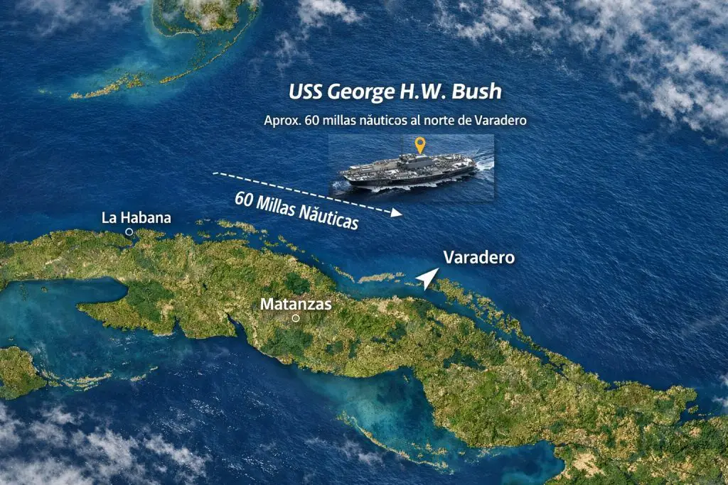En las últimas horas, las redes sociales y varios medios digitales se llenaron de rumores sobre la supuesta presencia del portaaviones nuclear estadounidense USS George H. W. Bush a unas 60 millas náuticas al norte de Varadero. La información, basada en datos de plataformas de seguimiento marítimo como Marine Traffic, encendió las alarmas entre cubanos dentro y fuera de la Isla.